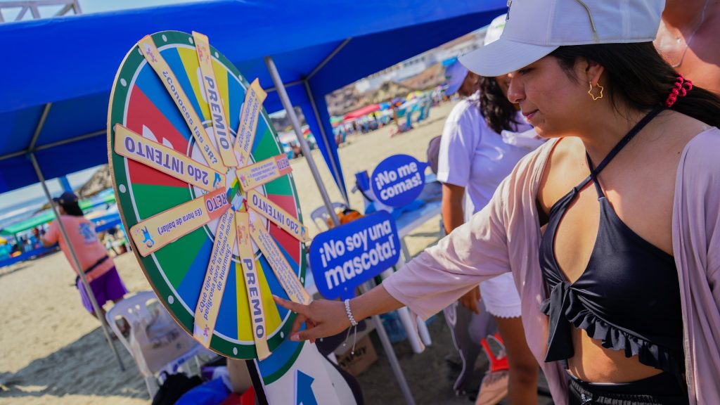 Con la implementación de una estructura de ingreso, letreros y señalizaciones ubicados en distintos puntos de la playa, se compartieron mensajes que promovieron el cuidado ambiental y generaron conversación entre los visitantes. Entre ellos destacó: ¡Que la huella que dejes sea la de tus pies, no la de tu basura!